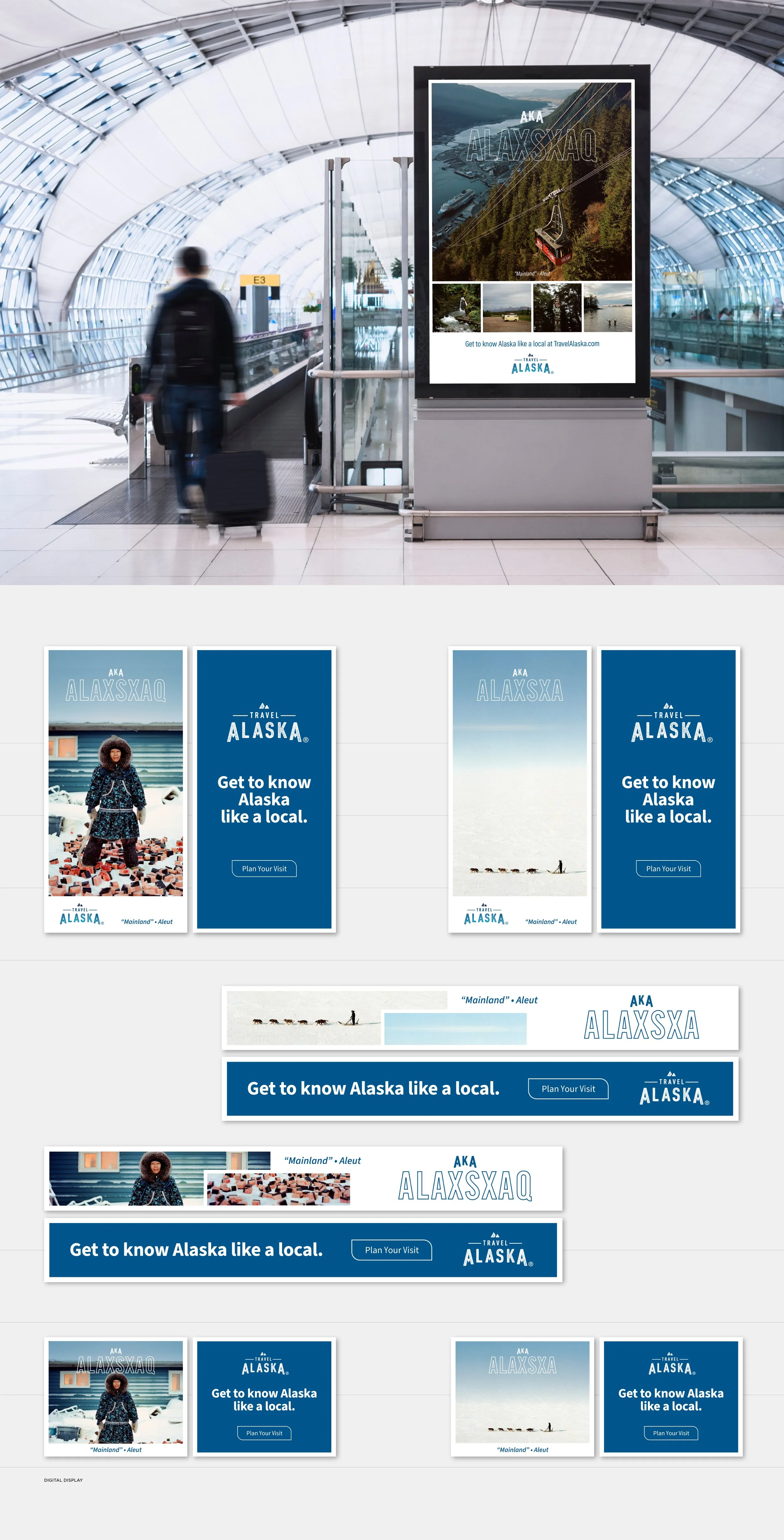 This project was developed as a speculative concept to explore ideas around building on the success of Visit Alaska’s “Also Known As” campaign. I wanted to use familiar campaign visuals, but deepen the storytelling by connecting Alaska’s locations with its rich culture and history. Instead of focusing solely on stunning vistas and wildlife, I wanted to show more people and introduce indigenous names that help reveal the state’s diverse identity.
